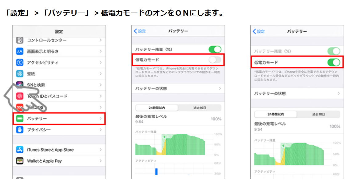 iPhoneの場合: 「設定」>「バッテリー」➡ 「低電力モード」で設定できます